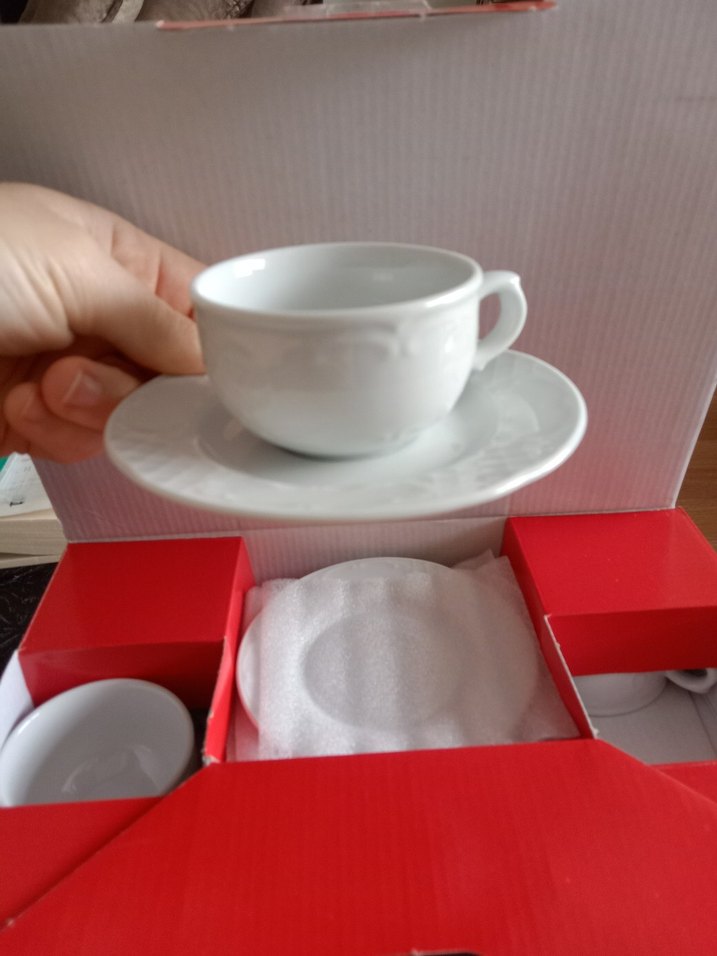 Sıcak içecekler için beyaz seramik fincan ve tabak seti, pürüzsüz yüzeye sahip. Kırmızı kutuda saklama imkanı sağlar. ☕