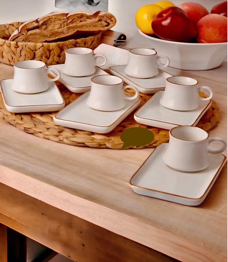 12 parçadır.Beyaz seramikten yapılmış fincanlar ve kare tabaklar seti, hafif bir tasarıma sahip. Kahve veya çay için uygun. ☕