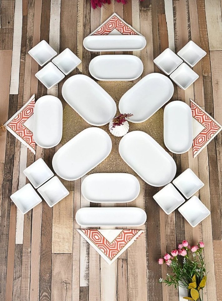 Çeşitli şekillerde beyaz seramik kahvaltı kapları, kahvaltı sunumu ve düzenlemesi için uygundur. Set, dikdörtgen ve kare tabaklar içerir. ️