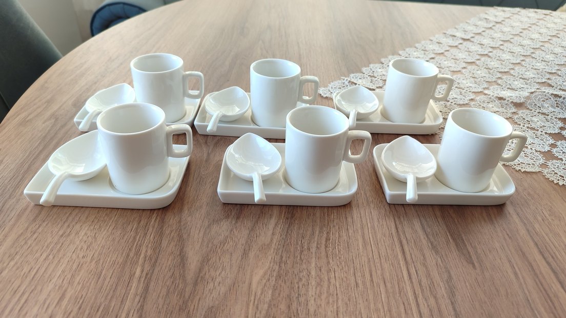 Beyaz seramik kahve fincanları, dikdörtgen tabaklar ve yaprak şeklinde kaşıklarla birlikte sunulur. ☕