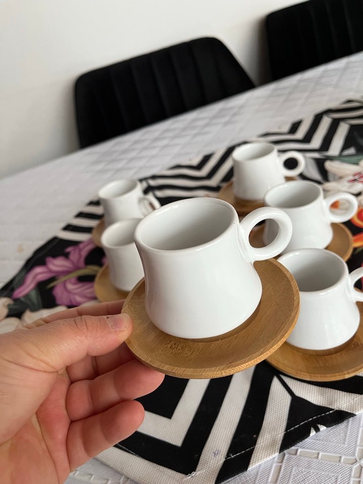Beyaz Seramik Kahve Fincanı ve Ahşap Tabak