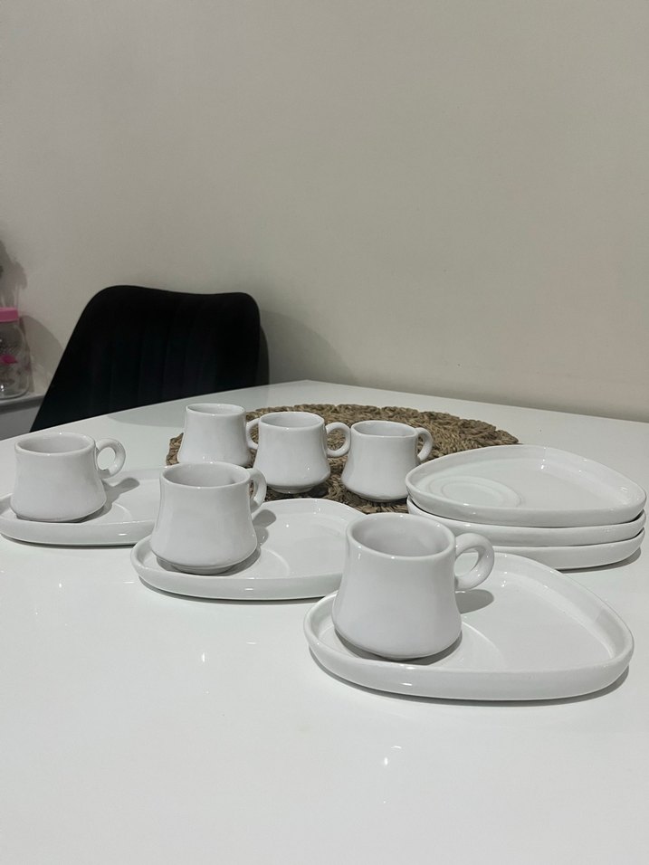 12 parça 6 fincan 6 tabak Beyaz seramikten yapılmış küçük kahve fincan ve tabaklar. Modern ve sade tasarıma sahip, espresso veya Türk kahvesi için uygun. ☕
