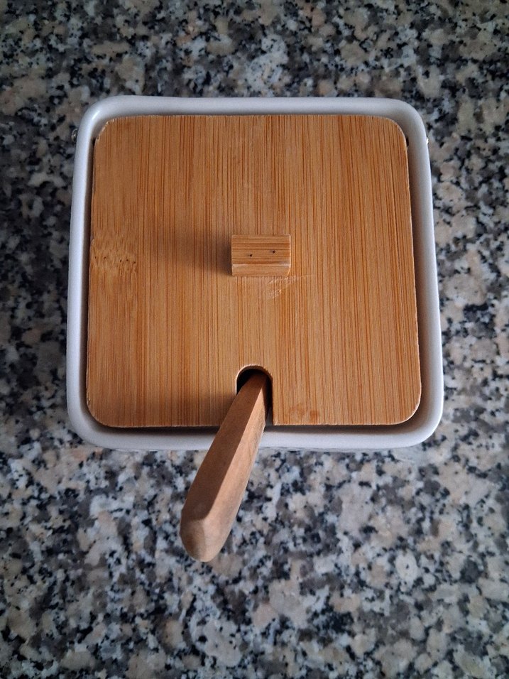 Beyaz seramikten yapılmış, bambu kapaklı ve ahşap kaşıklı baharat kabı. Kapakta kaşık için açılan bir yuva bulunur. ️temiz problemsiz ayrıntılar ve ölçüler fotoğraflarda #acarhome #madamcoco #engilishhome #tezgahüstütuzluk