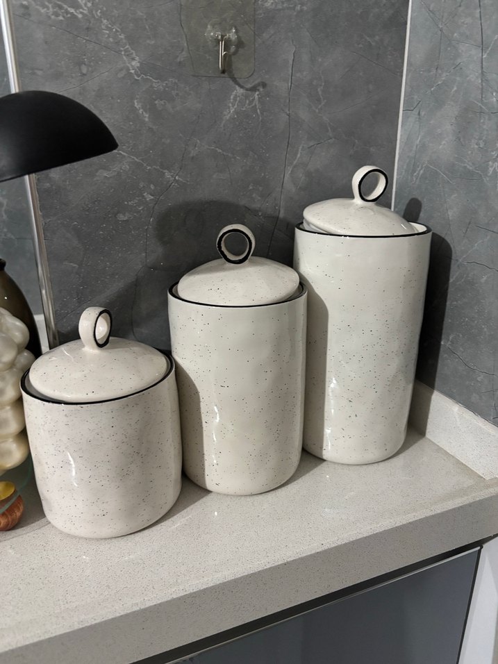 Kapaklı beyaz seramik mutfak saklama kavanozları, gri benekli sade tasarım ile mutfağınızı düzenler.