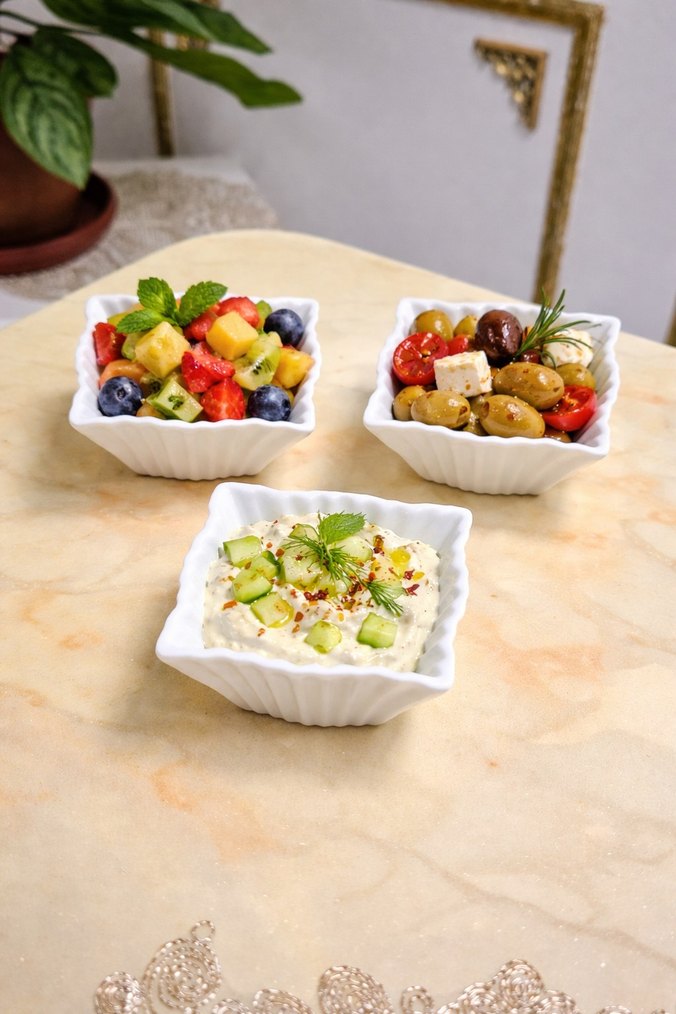 Üç beyaz seramik kare mini kase içeren set, küçük porsiyon salata, sos veya atıştırmalıklar için uygundur. Şık ve temiz tasarıma sahiptir. ️