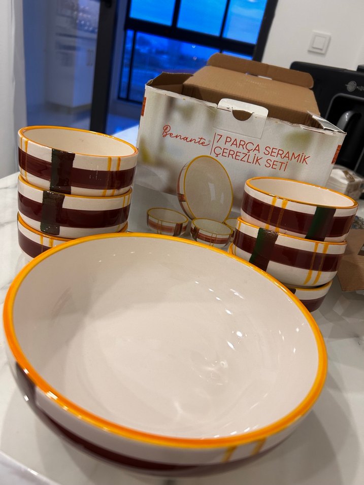 Karton kutuda 3'lü beyaz seramik kase seti, koyu ve sarı detaylarla. Yemek servisinde kullanılabilir.