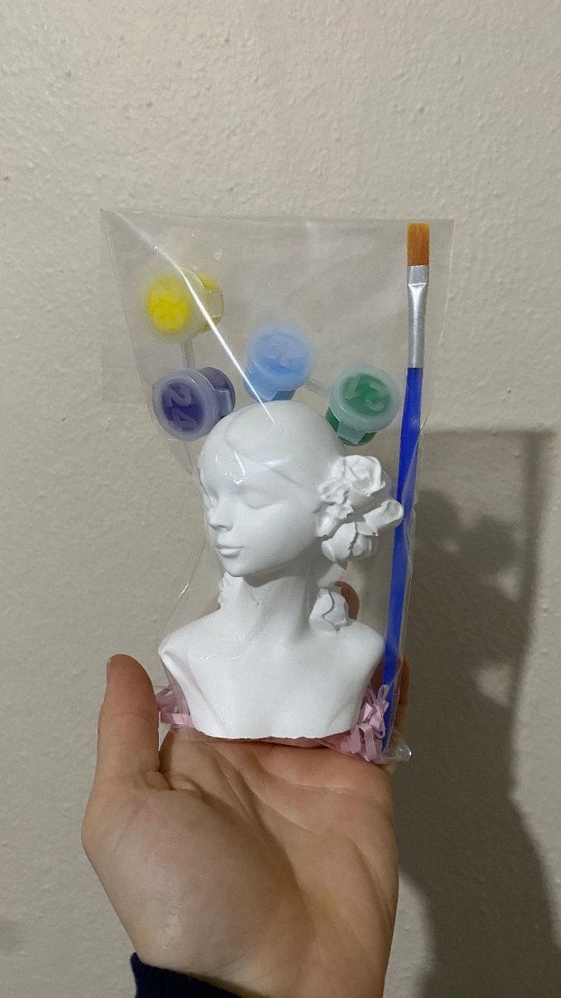 Pastel renkli boyalar ve fırça ile birlikte beyaz seramik kız büstü bebek