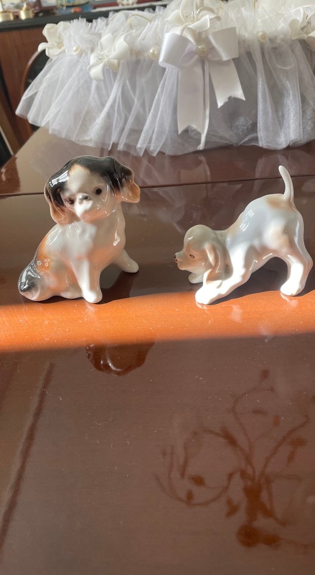 İki beyaz seramik köpek figürü, açık kahverengi ve siyah detaylarla, oyun oynayan ve oturan pozlarda. Dekorasyon için uygun.