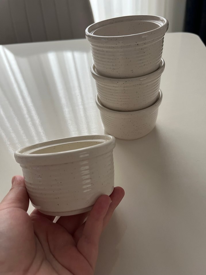 Beyaz seramikten yapılmış, dokulu ve sade tasarımlı küçük saklama kapları seti. Atıştırmalık veya küçük porsiyonlar için uygundur.