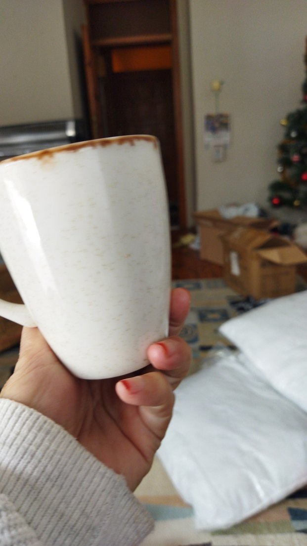 Bu beyaz seramik kupa, gri tonlarda hafif benekli bir desen ve biraz koyu renkte kenar ile tasarlanmıştır. ☕