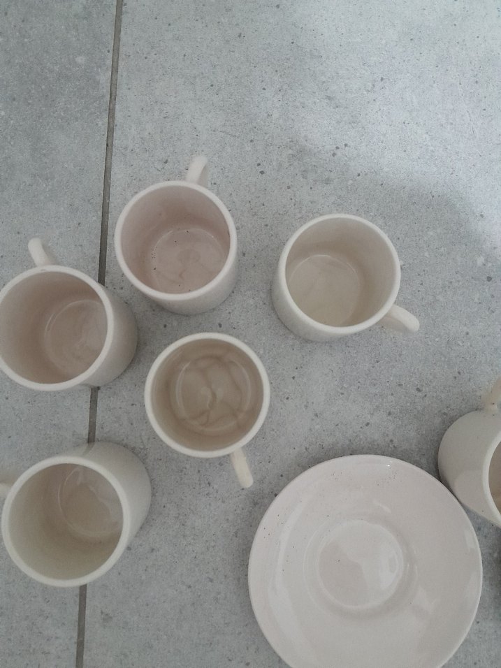 Beyaz seramikten yapılmış, pürüzsüz yüzeyli kupa seti. Sıcak içecekler için uygun, çoklu kupa ve uyumlu bir tabağı içerir. ☕ LEKELİ 4 TABAĞI VAR
