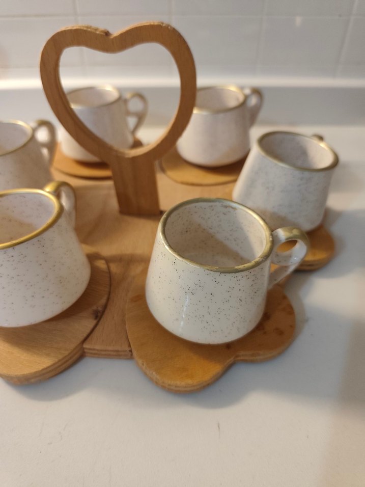 Altın detaylı, açık renkli beyaz seramik mini fincanlar ve kalp şekilli saplı ahşap stand içerir. ☕