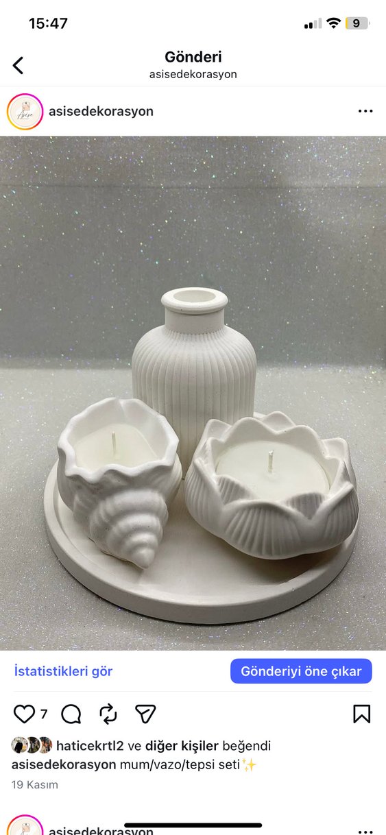 Beyaz seramikten yapılmış, yumuşak ve şık tasarımlı deniz kabuğu ve çiçek şeklinde mumluklar, yuvarlak tepsi üzerinde.