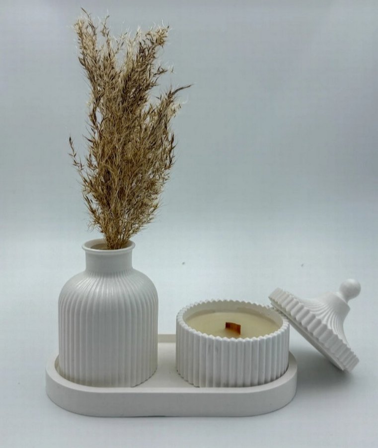 Beyaz seramik vazoya kurutulmuş çiçekler ve ahşap fitilli mumlu uyumlu mumluk tepsi üzerinde yer alıyor. ️
