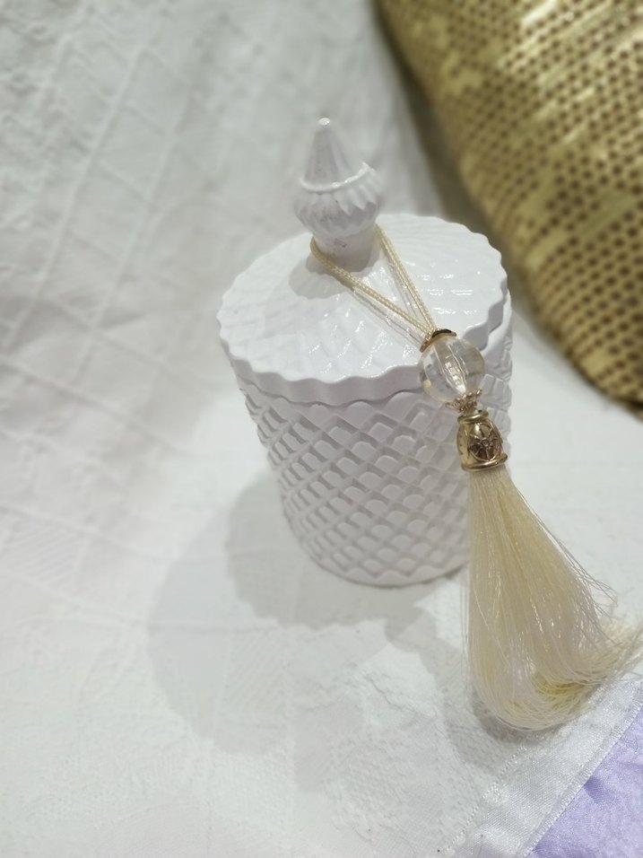 Dokulu desenli, dekoratif kapaklı beyaz seramik mumluk. Hafif ve şık tasarım, püskül detaylı.TOPLU ALIMDA HAM OBJE 50 TL