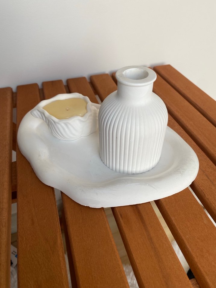 Beyaz seramikten yapılmış, kabartmalı vazosu ve dekoratif tabağıyla zarif bir mumluk seti. ️