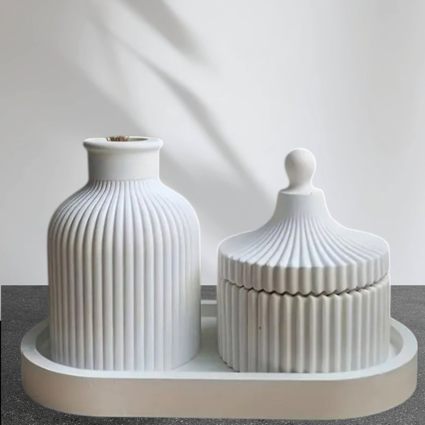 Beyaz seramikten yapılmış, kabartmalı dokusu ve mat yüzeyi olan mumluk ile kapaklı kutu seti. ️