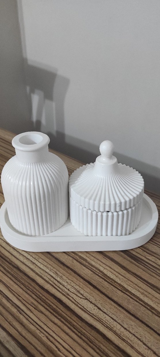 Beyaz seramikten yapılmış, kabartmalı desenli mumluk ve kapaklı saklama kabı, oval tepsi üzerinde yer alır. Hafif dokulu yüzeye sahiptir. ️