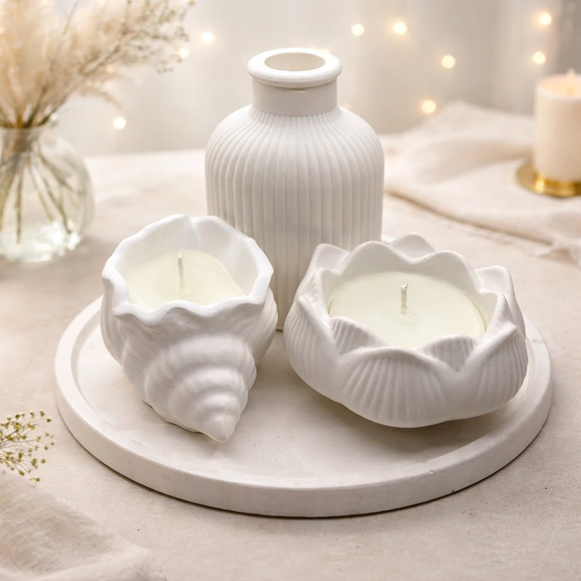 Kabuk ve çiçek şeklinde dokulu beyaz seramik mumluklar ve mumlar, kabartmalı desenli vazoyla birlikte. ️