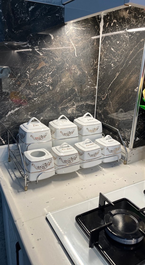Gri desenli beyaz seramik baharat kavanozları, kapaklı ve metal raflı, mutfakta düzenli saklama için. Kapağının tekini bulamadım bana hediye gelmişti hiç açmadan saklamıştım bulursam eklerim bulamazsam bu fiyata veriyorum o yüzden uygun