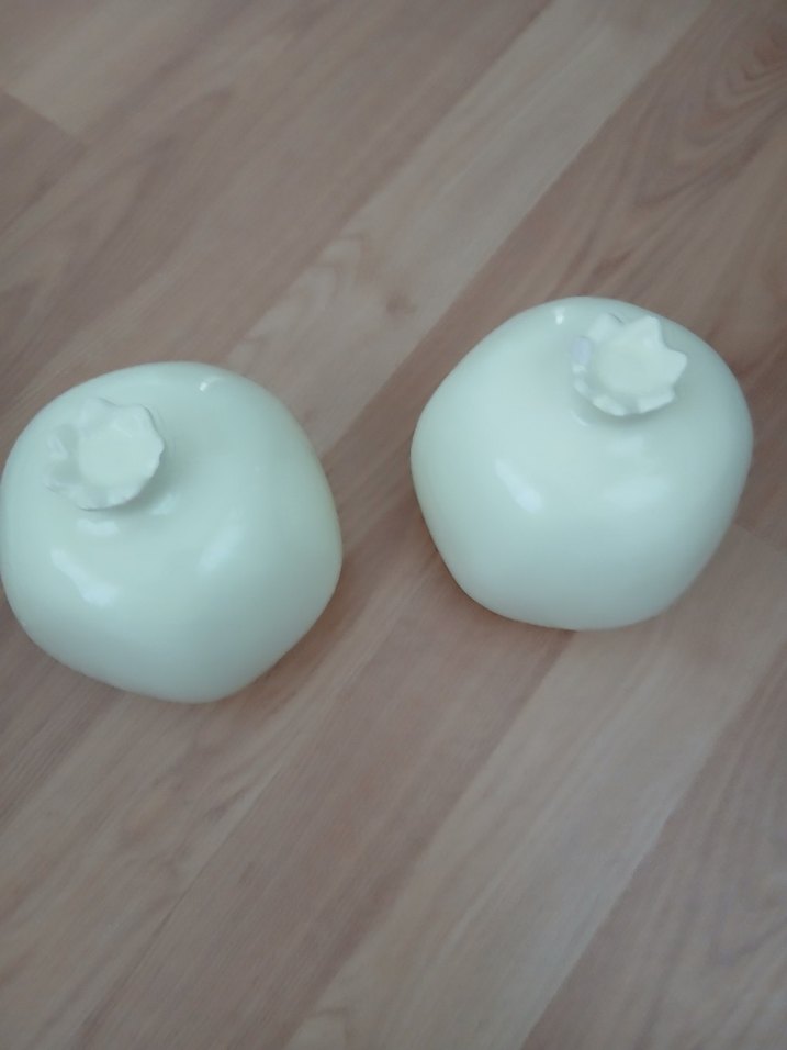 İki adet açık beyaz, seramik nar figürü. Düzgün yüzeyli ve sade tasarımlı dekoratif ürünler.