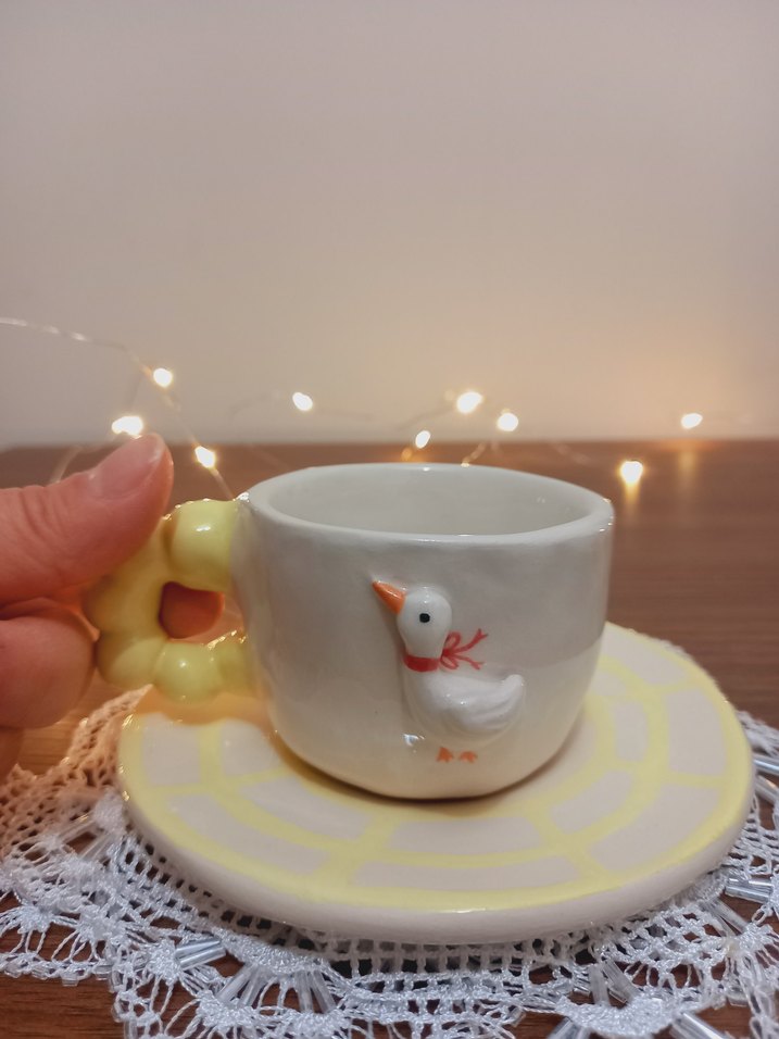 Pastel sarı sap ve tabana sahip beyaz seramik fincan ve tabağın üzerinde küçük bir ördek figürü bulunur. Çay veya kahve sunumu için uygundur. Ürün gıdaya uygundur elde yıkama önerilir. 1 adet vardır. almadan önce mevcut olup olmadığını sorun