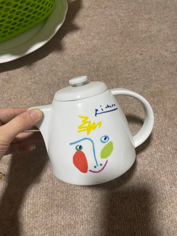 Pastel renkli soyut yüz desenli beyaz seramik çaydanlık. Yuvarlak kulp ve kapaklı, çay sunumu için uygun.