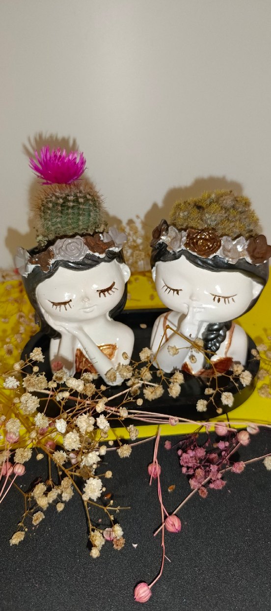 Çiçekli taçlarla süslenmiş, küçük kaktüsler tutan beyaz seramik ikili figürinler. Huzurlu ifadeleriyle dekorasyon için uygundur.