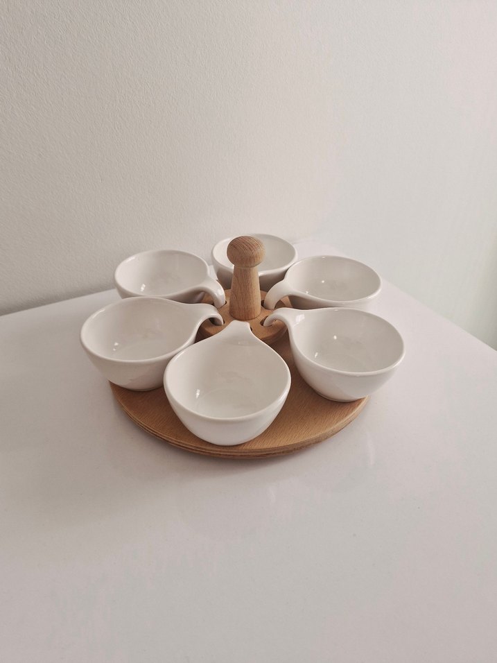 Ahşap stand üzerinde döner tabaklı, seramik sosluk seti. Soslar veya baharatlar için uygundur.