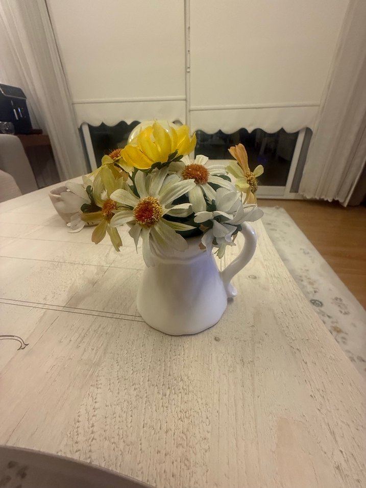 Beyaz seramik sürahi içinde sarı ve beyaz yapay çiçek aranjmanı, hafif dekoratif bir dokunuş sağlar.