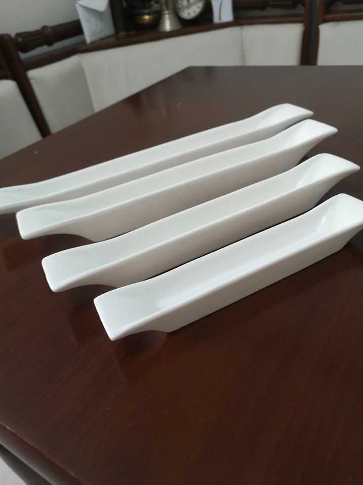 Farklı boylarda dört adet beyaz seramik uzun sunum tabağı,zeytin çerez ve atıştırmalıklar için uygundur. ️