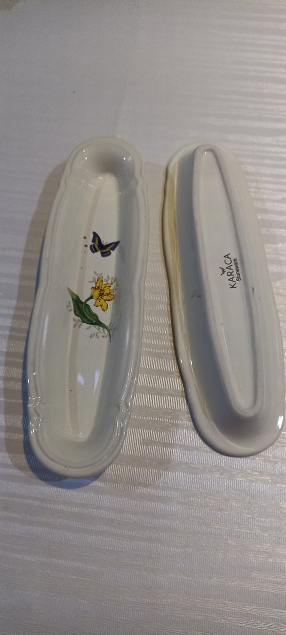 Karaca markalı, çiçek ve kelebek desenli beyaz seramik uzun tabak. Küçük atıştırmalıklar için uygundur.2 adet