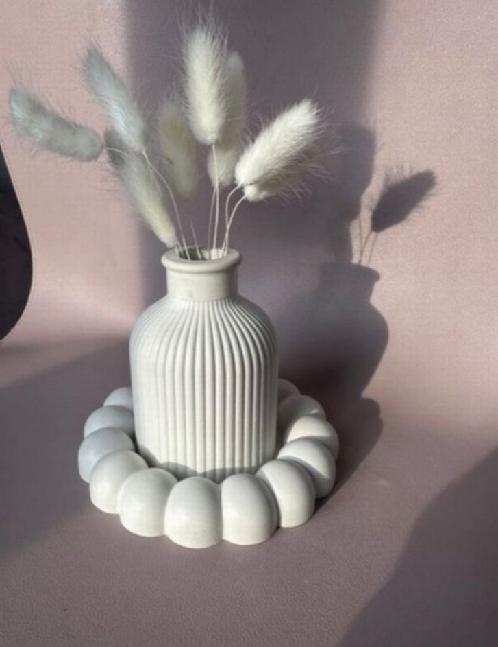 Dikey çizgili beyaz seramik vazo ve etrafında yuvarlak, pürüzsüz beyaz kürelerden oluşan dekoratif çerçeve.
