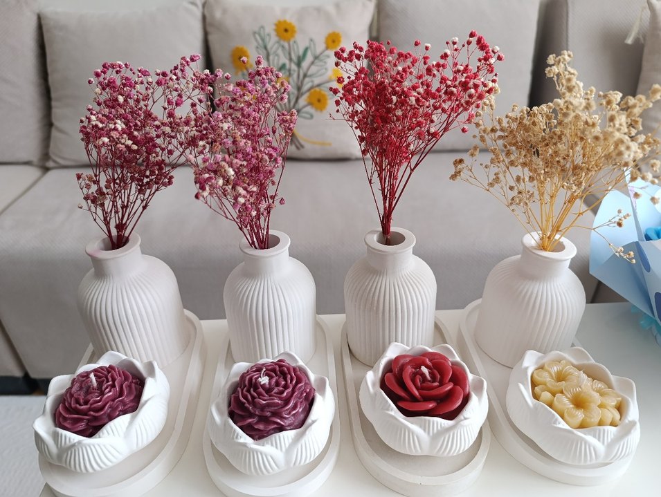 Vazo, altlık, mumluk. Mum ve kuru çiçek dahildir. Beyaz seramik vazolar içinde kurutulmuş çiçekler ve kırmızı ile mor tonlarında gül şeklinde mumlar içeren dekoratif set.