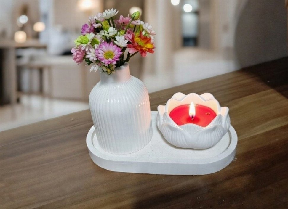 Beyaz seramikten yapılmış, yapay çiçekli ribbed vazo ve lotus şeklinde mumluk, dikdörtgen taban üzerinde yer alır. ️