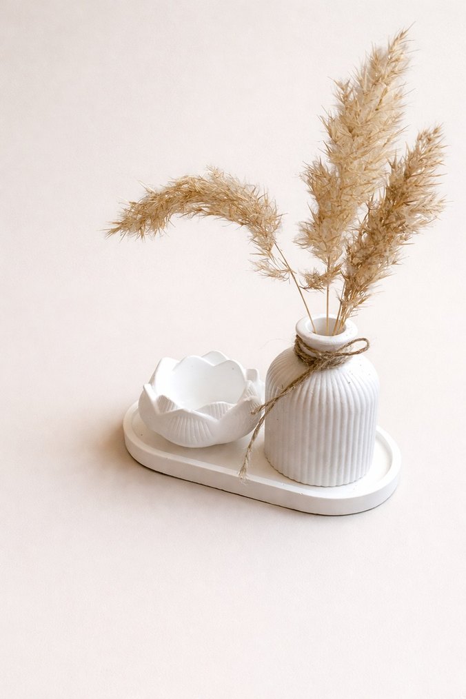 Dokulu yüzeye sahip beyaz seramik vazo ve uyumlu tepsi seti, doğal kurutulmuş otlarla süslenmiştir. Mekâna zarif bir dokunuş katar.