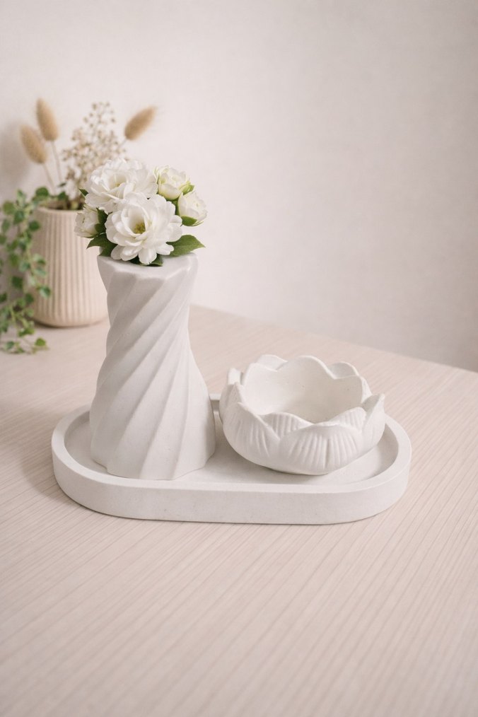 Beyaz Seramik Vazolu Dekoratif Set