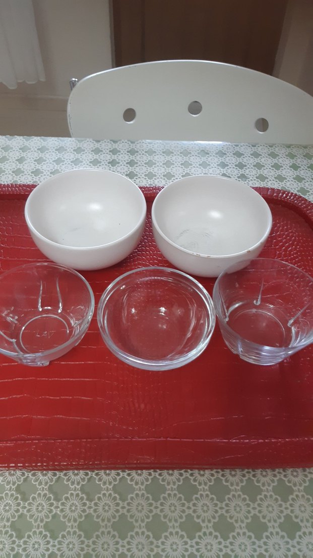 İki beyaz seramik kase ve üç farklı boyutta şeffaf cam kase içeren klasik tasarımda set. ️