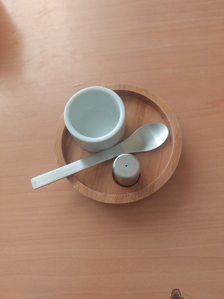 Yuvarlak ahşap tabakta beyaz seramik yumurtalık , gri metal kaşık ve küçük bir tuzluk içeren set.Güzel bir hediye olabilir