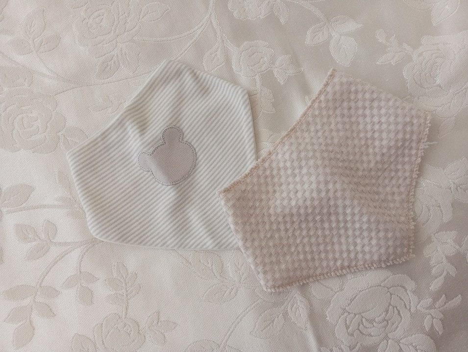 Beyaz ve Bej tonlarda iki adet bebek önlüğü seti. Biri yumuşak çizgili dokuda ayıcık detayıyla, diğeri dokulu desene sahip.