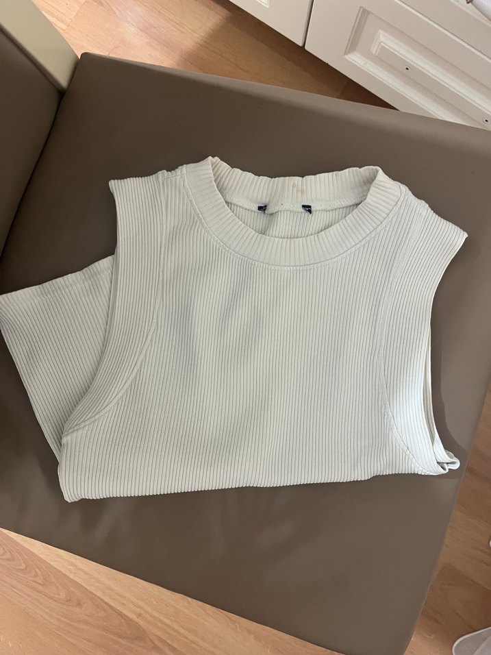 Beyaz, kolsuz, fitted kesim triko süveter. Yumuşak keten kumaştan, minimalist ve günlük rahat kullanıma uygun.