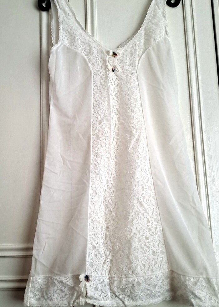 Beyaz dantel detaylı XS bedenden 36 Bedenlere kadar uyabilecek şifon gecelik, kombinezon. Dilerseniz iç göstermemesi için etek, elbise altına da giyilir çok amaçlı kullanılabilir. Ön kısmı ve etek uçları dantel detaylıdır. Çok şık bir model. Ürün sıfırdır kullanılmamıştır. Herhangi bir defosu yoktur. İade kargo süreçleri nedeniyle yoktur