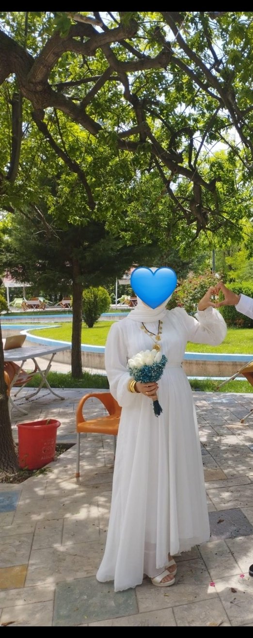 beyaz sade nikah elbisesi iç göstermez astarlı önü kısa arkası uzun bir saat kullanıldı beyaz şal ile birlikte gönderilecek pazarlık payı vardır