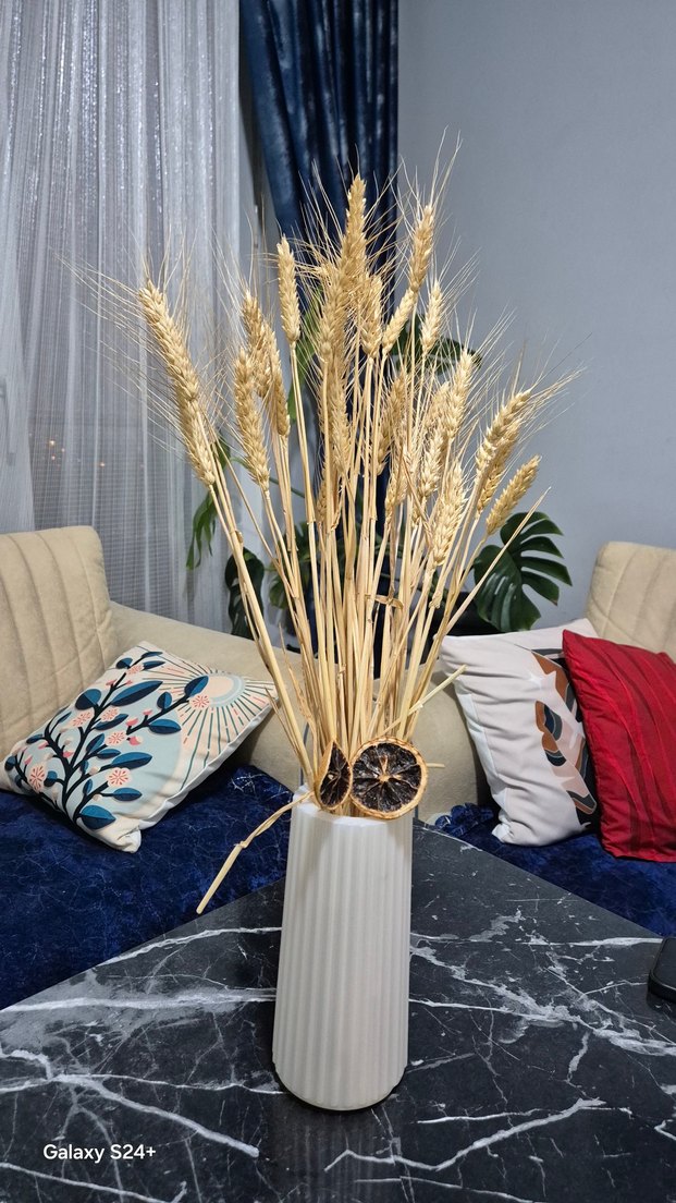 Uzun beyaz plastik vazo, üzerinde ince çizgiler bulunur. İçinde kurutulmuş buğday sapları ve dekoratif kuru narenciye dilimleri vardır. Doğal bir dokunuş katar.