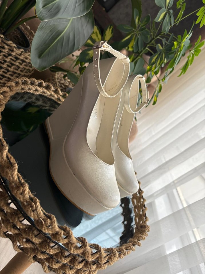 Kadın abiye ayakkabılar, beyaz silky kumaş, dolgu topuk ve tokalı bant ile şık ve zarif bir görünüm sunar. Gelinlik altına giyilmiştir.