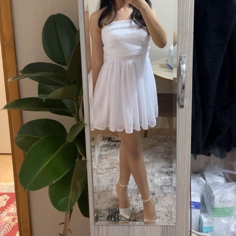 Straplez yakalı, dantel detaylı beyaz mini elbise, yumuşak sentetik kumaştan, klasik ve şık tasarım.