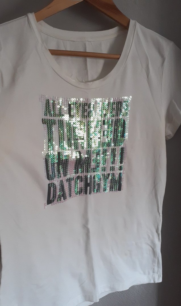 Beyaz, kısa kollu hamile tişörtü, yuvarlak yaka ve bol kesimlidir. Ön kısmında simli baskı detayı vardır. Romantik akşamlar için uygundur. ✨
