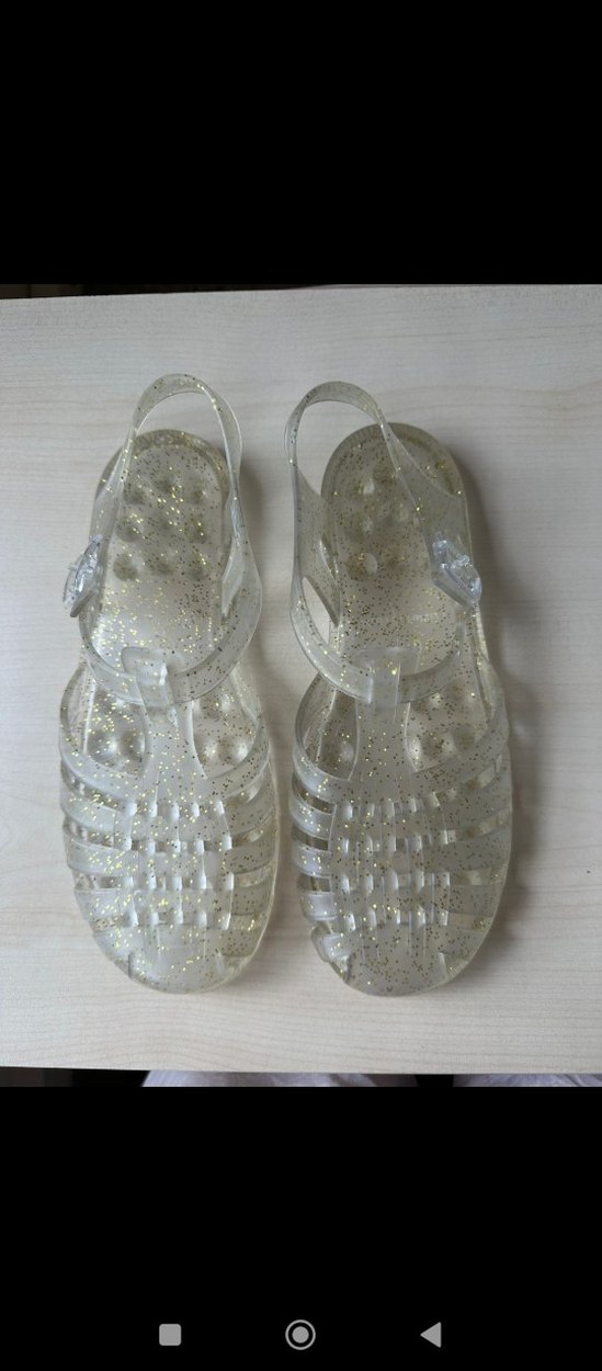 Beyaz simli kız çocuk sandaletleri, esnek plastikten yapılmış. Bohem tarzda, rahat örgü desenli ve arkadan bantlıdır. ✨