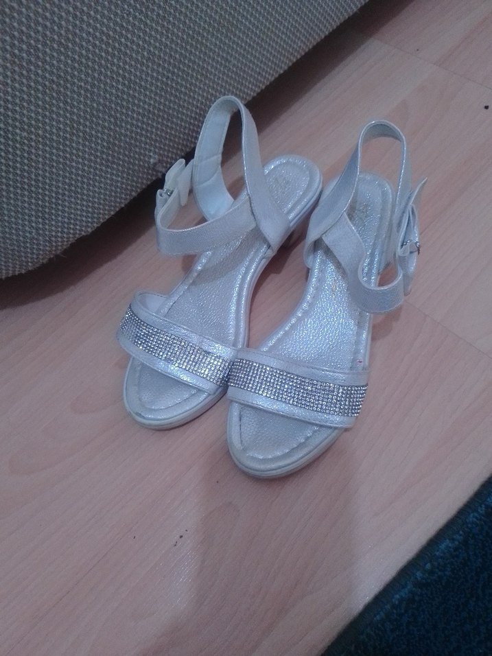 Beyaz simli dolgu topuklu kız çocuk abiye ayakkabı, kauçuk malzemeden. Parlak ve çağdaş tarzda, düğünler için uygun.
