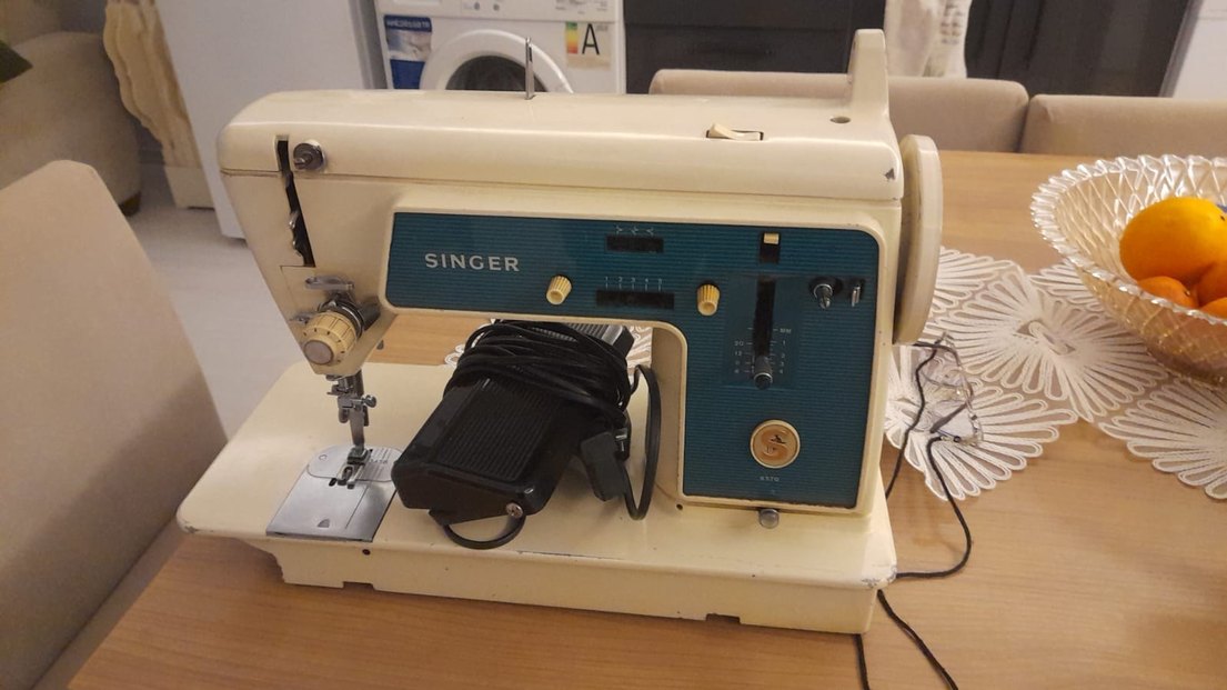 Ayarlanabilir özelliklere sahip beyaz Singer dikiş makinesi, ayak pedalı ile birlikte. Çeşitli dikiş işleri için uygundur. ✂️